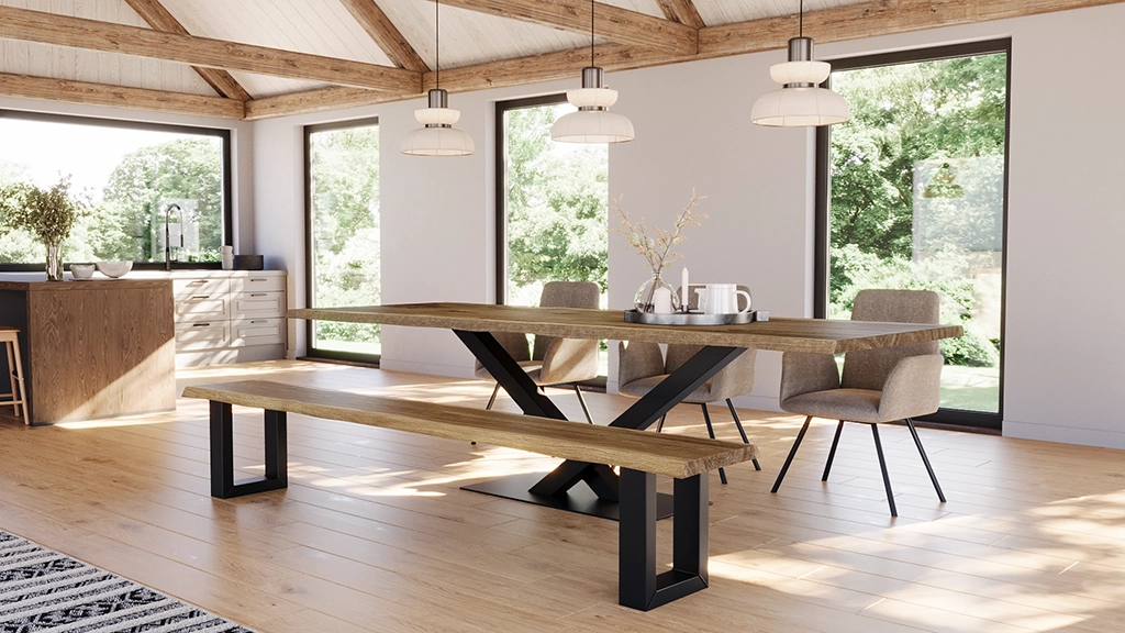 Een Steiger eiken tafel past daar moeiteloos tussen. Een massief blad met karakter, duidelijke nerf, voelbaar hout. Gecombineerd met een strak, stoer onderstel dat rust en design brengt. Oud ontmoet nieuw. Robuust ontmoet verfijning.